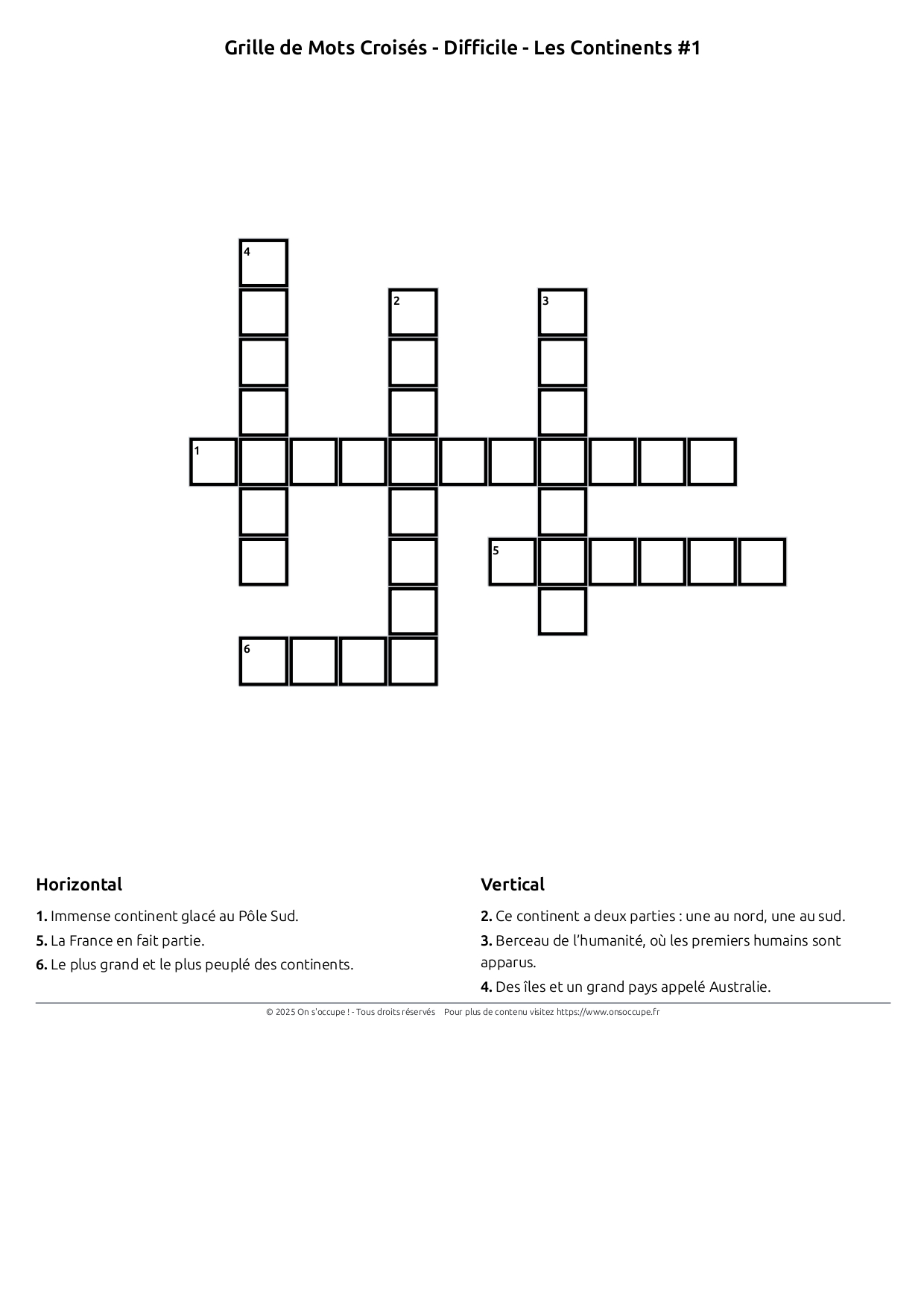 Téléchargez et imprimez gratuitement cette grille de mots croisés pour enfant, niveau difficile, sur le thème des continents. Un bonne façon de réviser sa géographie en s'amusant.