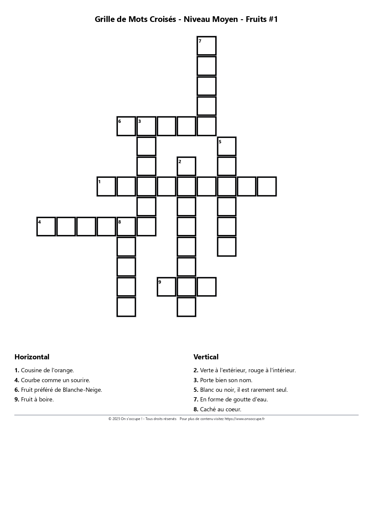 Une grille de Mots Croisés pour enfants, de niveau moyen, sur le thème des fruits. A imprimer gratuitement.
