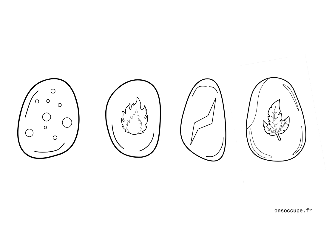 Imprimez gratuitement cette planche à colorier avec 4 pierres évolutives inspirées de Pokémon : Pierre-Eau, Pierre-Feu, Pierre-Foudre et Pierre-Plante.